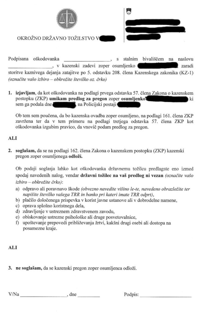 V kolikor se odloči tožilec za poravnavo, oškodovancu pošlje obvestilo o naroku za odložitev kazenskega pregona skupaj s soglasjem.