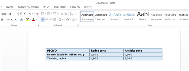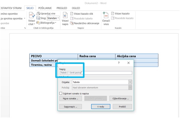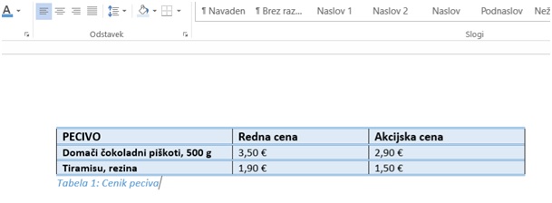 - Opazili bomo napis Tabela 1:, kamor dodamo želeno ime tabele, v našem primeru smo izbrali »Cenik peciva«. Potrdimo vnos.