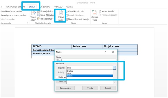 - Izberemo zavihek SKLICI, nato izberemo VSTAVI NAPIS in pod različnimi možnostmi (v našem primeru) izberemo TABELA.