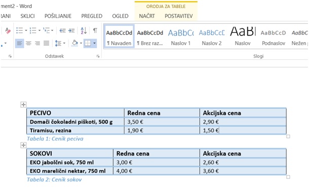 - Najprej se z miško postavimo pod prvo tabelo v dokumentu.