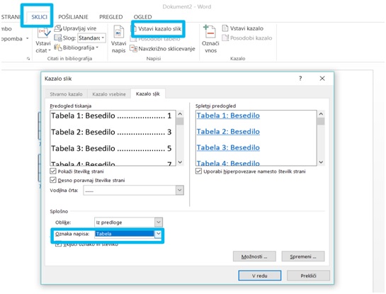- Ko smo poimenovali vse tabele, sledi izdelava kazala. Z miško se postavimo na mesto, kamor želimo dodati kazalo tabel. Izberemo zavihek SKLICI in nato VSTAVI KAZALO SLIK. Odprlo se bo okno, v katerem moramo v polju OZNAKA NAPISA obvezno izbrati TABELA. Na tem mestu lahko nastavimo tudi oblikovne lastnosti kazala, ki ga nameravamo vstaviti v dokument.