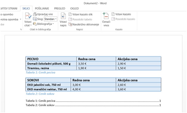 - Na želenem mestu se nam bo izpisalo kazalo tabel.