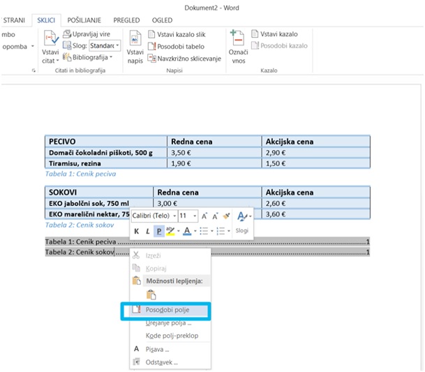 - V kolikor bomo v dokument dodajali nove tabele, moramo po končanem delu kazalo tabel posodobiti. To storimo tako, da kliknemo na kazalo in izberemo POSODOBI POLJE.