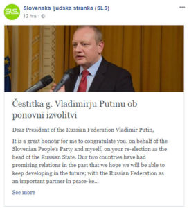 Vladimir Putin je z najvišjo podporo na volitvah do sedaj ponovno dokazal, da kot predsednik Ruske federacije nima konkurence. 76,7% podpore volivcev kaže, da ga ruski državljani močno podpirajo, verjetno tudi zaradi svoje močne drže nasproti najmočnejšim svetovnim voditeljem. Putin, ki vedno stoji za svojimi prepričanji se ne pusti izsiljevati je znan po svojem patriotizmu. Eden redkih in edini slovenski strankarski politik, ki mu je čestital za ponovno izvolitev je bil mag. Marko Zidanšek, predsednik SLS. Podmladek njegove stranke Nova generacija sicer zelo dobro sodeluje s podmladkom putinove stranke Young Guard of United Russia.