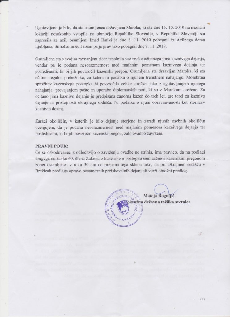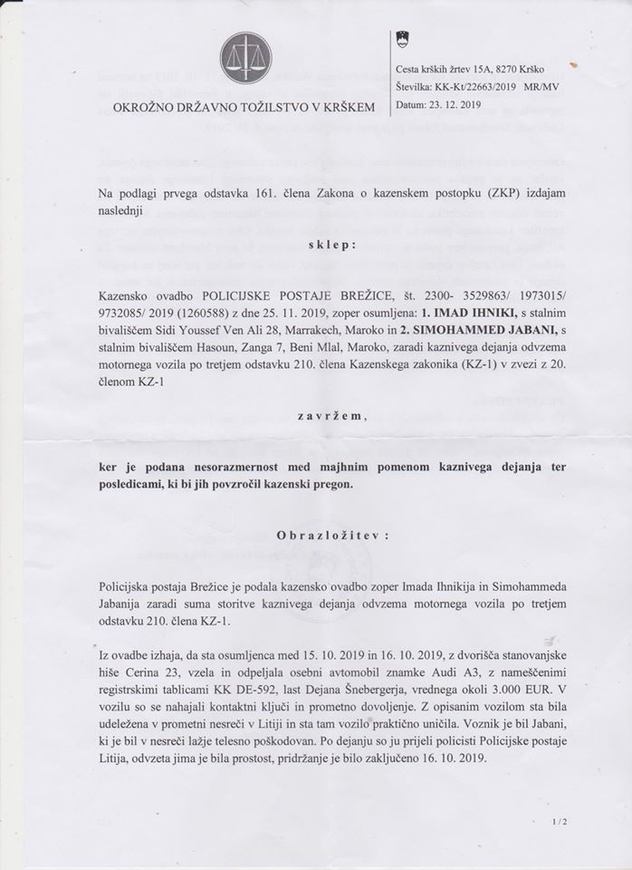 V luči takšnega nesmisla lahko beremo odločitev Okrožnega državnega tožilstva v Krškem, ki je v zgoraj omenjenem primeru odločilo, da kazensko ovadbo zoper Maročanoma zavrže, ker je podana nesorazmernost med pomenom kaznivega dejanja ter posledicami, ki bi jih povzročil kazenski pregon. Preprosto povedano, ukradla sta premalo vreden avto, ali mogoče nepomembnemu državljanu, ki bo avto, vreden po uradni oceni 3.000,00 evrov, že prebolel in si kupil novega.