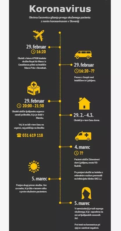 Po do sedaj znanih podatkih in preverjenih, je prvo okuženi, 60-letnik iz Ljubljane, bil na počitnicah v Maroko z devetnajstimi potniki (šestnajstimi Slovenci in tremi Hrvati). Iz Maroka so se vračali v soboto 29. februarja in pristali na letališču Marko Polo v Benetkah ob 16.25, z letom AT 938. Takrat naj bi že imel bolezenske znake, ki pa jih je pripisoval poškodbi, ki jo je dobil v Maroku. Žal je nemogoče zagotovo trditi, ali se je okužil v Maroku, ali na letališču preden je odpotoval v Maroku. Pot je nadaljeval z GoOpti, kjer se je skupaj še z 8 potniki odpeljal v Ljubljano. Še istega večera se je odpravil v UKC Ljubljana, zaradi poškodbe. V UKC Ljubljana je bil med 20.00 in 21.30. Vso zdravstveno osebje, ki naj bi takrat bilo v stiku z okuženim so že dobili ustrezna navodila. Vendar se kalvarija prvo okuženega še ni končala. Zaradi zdravstvenih težav je 4. marca obiskal zdravnika v Zdravstvenem domu Ljubljana Vič-Rudnik. Sestri, ki je delala triažo ali ni zmogel ali ni želel povedati, da je bil na potovanju in kakšne so njegovi simptomi. Bil je tako slaboten, da je med čakanjem na pregled celo ležal na klopeh pred ambulanto. Ko ga je zdravnik pregledal je posumil na koronavirus in po posvetu z epidemiologom napotil okuženega na Kliniko za infekcijske bolezni in vročinska stanja UKC Ljubljana. Na kliniko ga je odpeljalo reševalno vozilo, kjer so po narejenem testu potrdili okužbo. Vso zdravstveno osebje in obiskovalci, ki so bili v času obiska obolelega izpostavljeni, so prav tako s situacijo seznanjeni in so že prejeli ustrezna navodila.