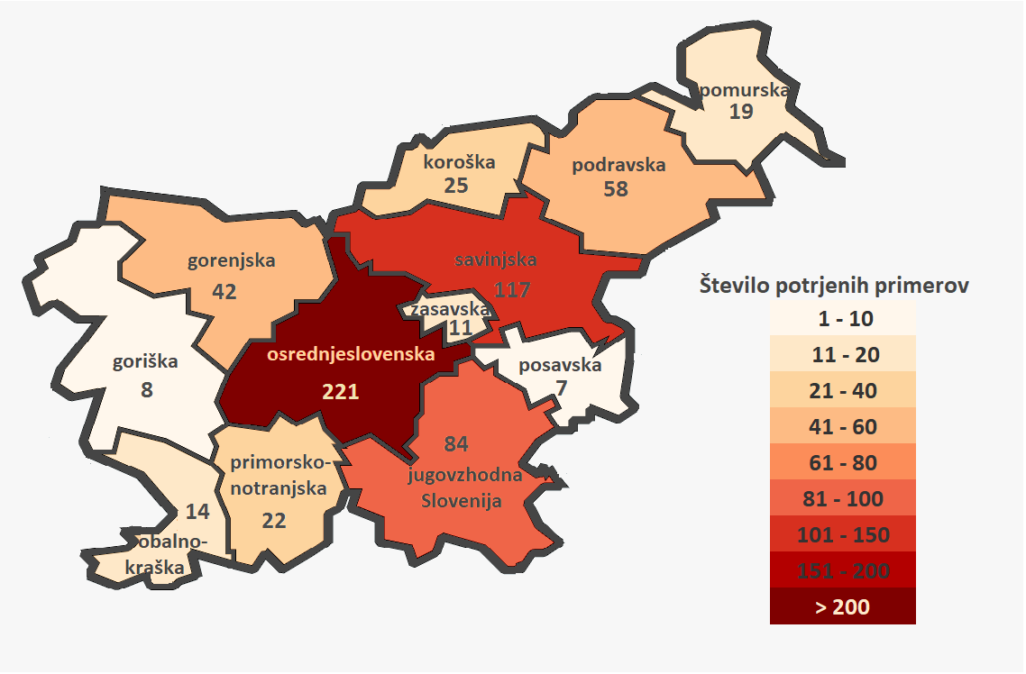Do danes je bila okužba s covid-19 v Sloveniji potrjena pri 632 osebah (70 več kot dan pred tem). Odvzetih je bilo 18.369 brisov (od tega včeraj 1075). V zadnjih 24 urah smo zabeležili dve smrtni žrtvi. Skupno je v Sloveniji za posledicami koronavirusa umrlo že devet oseb. Hospitaliziranih je trenutno 90 oseb, od tega 22 na intenzivni negi.