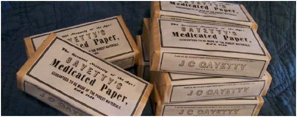 Zato se izum Američana Joseja Gayettija, ki velja za izumitelja toaletnega papirja, ni takoj ukoreninil. Gayetti se je kot prvi lotil izdaje vnaprej razrezanega papirja v svežnjih. Guyettijeva prva serija toaletnega papirja je izšla leta 1857. V papirju je bila konoplja, namočen je bil v aloe vero in na njem je bil vodni žig z imenom proizvajalca, kar so bili dodatki za medicinski učinek, ki naj bi prispeval k preprečevanju hemoroidov. Papir se je zato imenoval »Medicated paper«. Vendar pa kupci papirja niso željno sprejeli, deloma zaradi tega, ker je bilo potrebno papir kupiti, deloma zaradi tega, ker je intimna toaleta ostala absolutni tabu, zato je le malo ljudi lahko odšlo v trgovino in, ne da bi hudo zardevalo, kupilo ta papir. Približno v istem času in z istim namenom je v Evropi Britanec William Alcock izdal »Papir Curlers«.