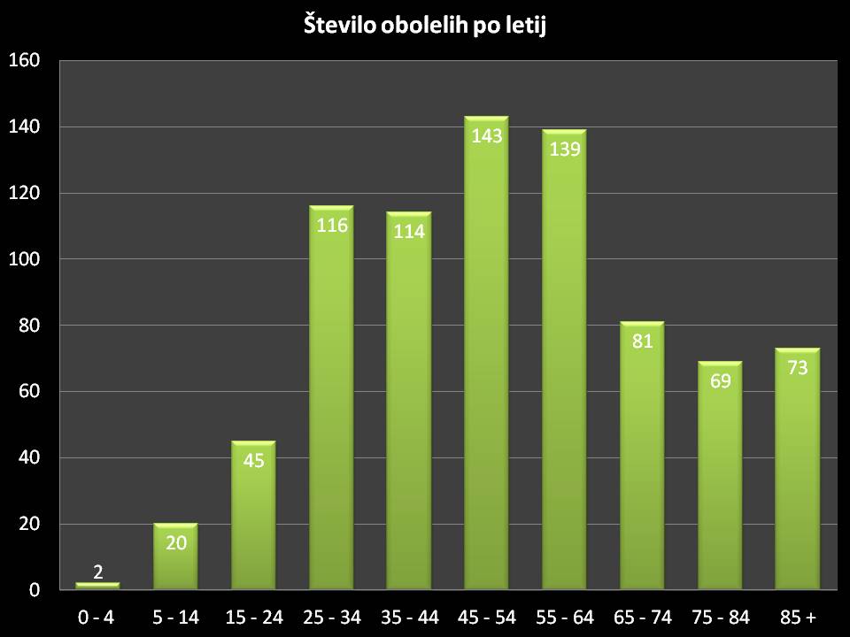 Še vedno je več okuženih žensk – 415 kot moških – 387. Največ bolnih je v starosti med 45 in 54 let, teh je kar 143, sledijo stari med 55 in 64 leti, teh je 139. Najmanj okuženih je otrok, mlajša od 4 let sta 2, a še ta preveč in med 5 in 15 letom jih je 20. Še vedno je največ okuženih v Ljubljani – 170 in Šmarju pri Jelšah – 97.