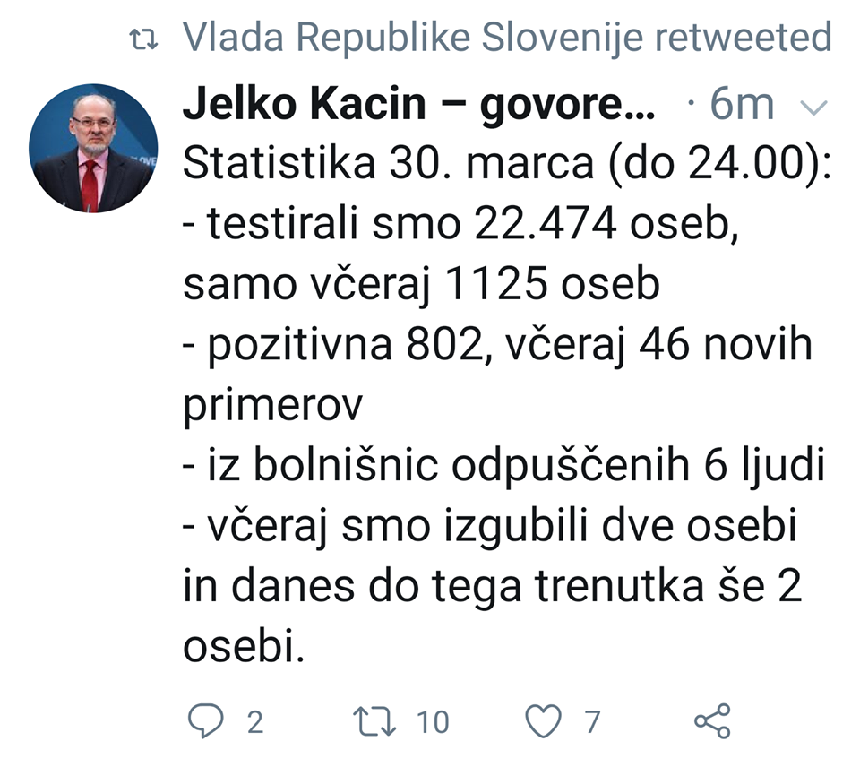 Številka okuženih po svetu vztrajno raste in se bliža milijonu, številka umrlih zaradi COVID-19 pa je že pri 40.000. Včeraj sta umrli 2 osebe, prav tako danes, tako imamo sedaj skupaj 15 umrlih ali 1,8 odstotkov. Opravljenih je bilo kar 1125 testov, skupaj že 22.474. Na novo je pozitivnih 46 oseb, torej skupaj 802.