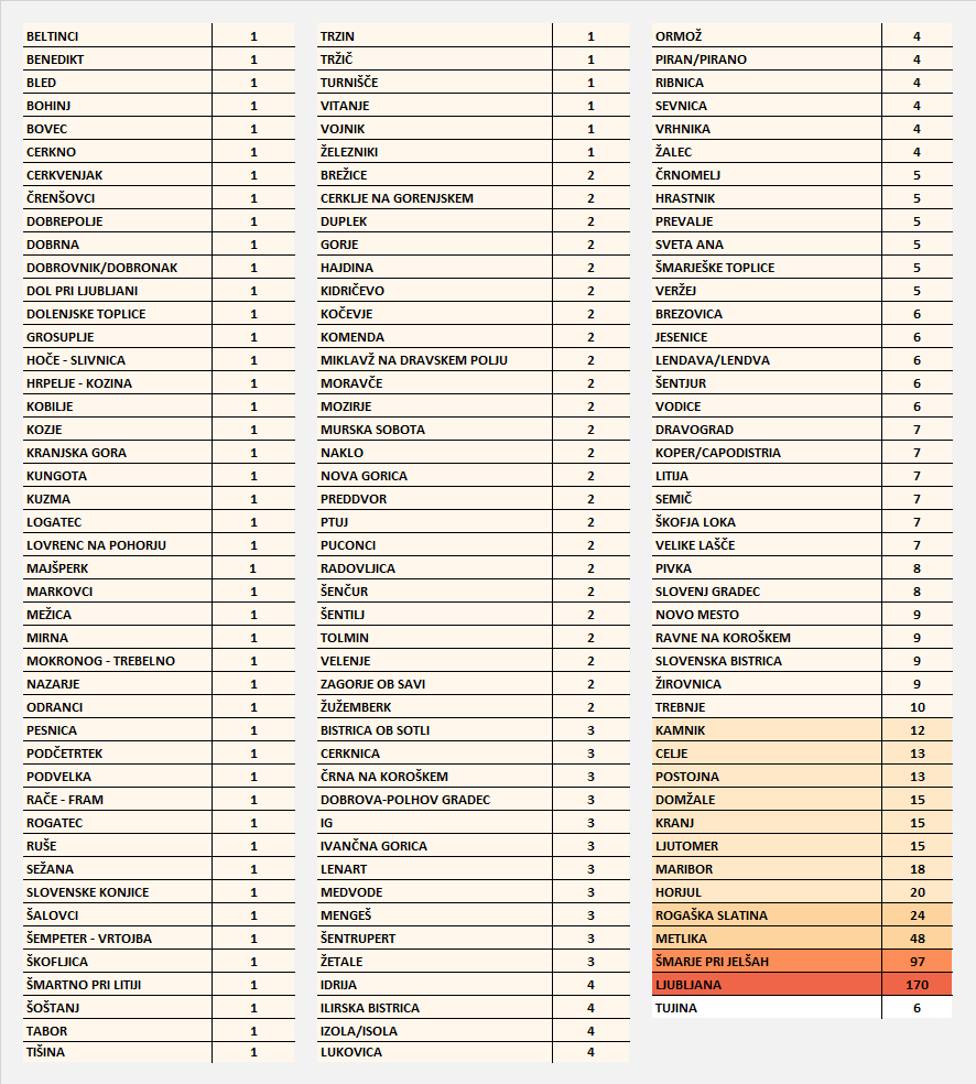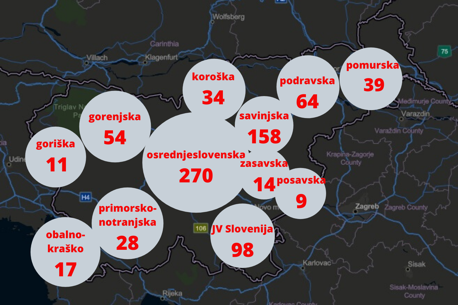 Delež občin, kjer so že potrdili okužbe so tudi povečuje in v kar 132 občinah imajo vsaj enega bolnega, kar znaša 62 odstotkov vseh občin v Sloveniji.