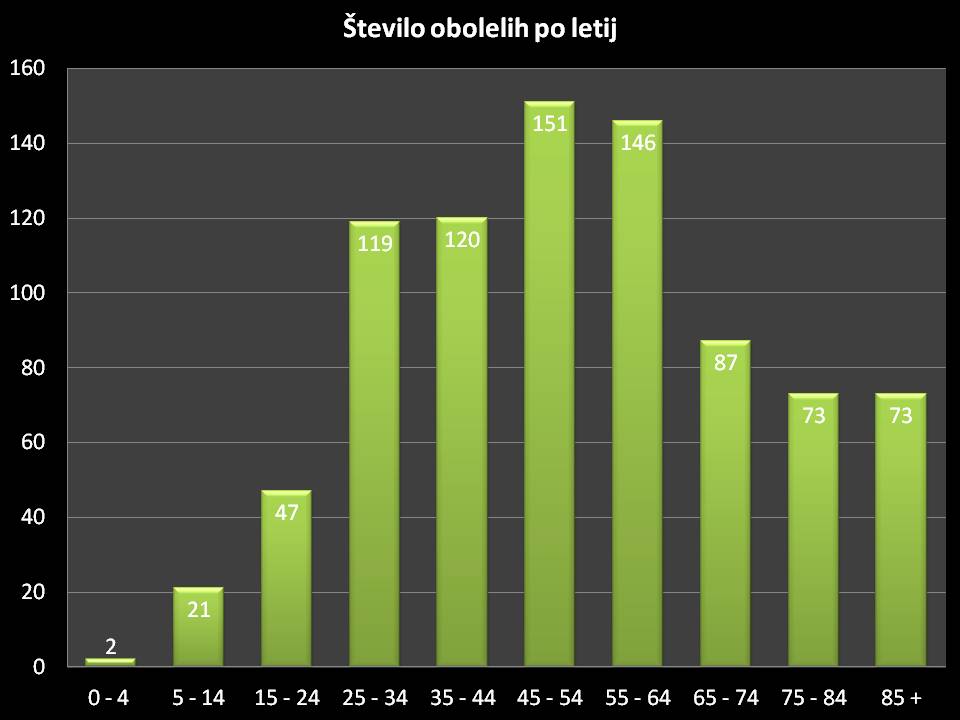Na novo okuženih je največ, kar 8 iz starosten skupine 45 – 54, sledijo iz starostne skupine 55 – 64, kjer je 7 na novo okuženih, 6 v starostni skupini od 35 – 44, prav tako v starostni skupini 65 – 74 let.