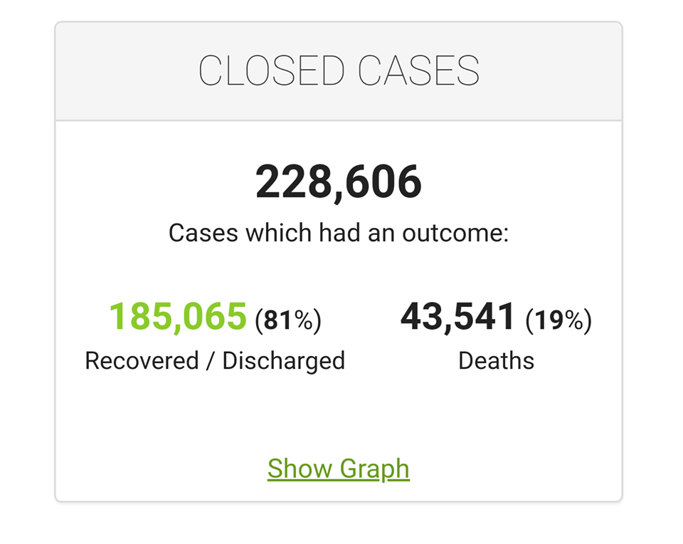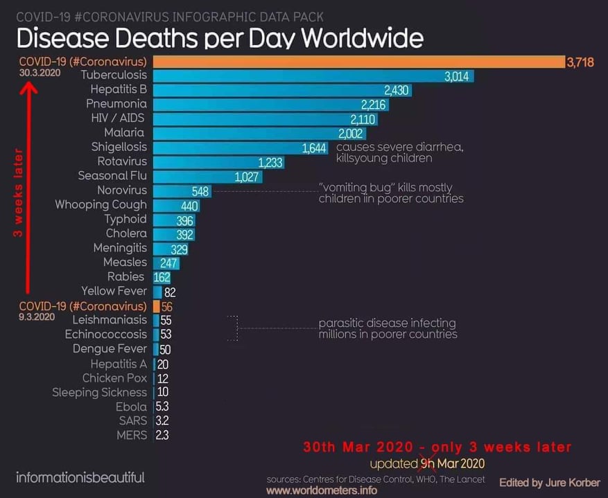 Po zadnjih znanih podatkih se je odstotek smrtnosti povzpel že na 19 odstotkov. Če so mnogi v začetku meseca marca še opominjali, da v povprečju na dan umre za npr. tuberkolozo, hepatitis B, gripo, HIV … bistveno več ljudi kot za koronavirus smo v samo 3 tednih to statistiko bistveno obrnili na glavo. Največ ljudi, kar 3.718 dnevno umre zaradi koronavirusom.