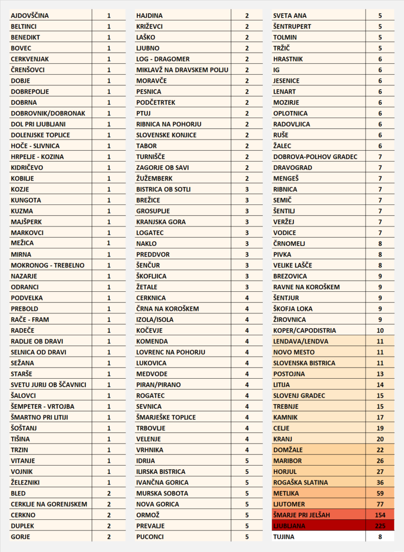 Vsaj en primer okužbe COVID-19 je potrjen v 146 občinah (69 odstotkov vseh slovenskih občin), več kot dva primera okužbe COVID-19 sta bila potrjena v 102 občinah.