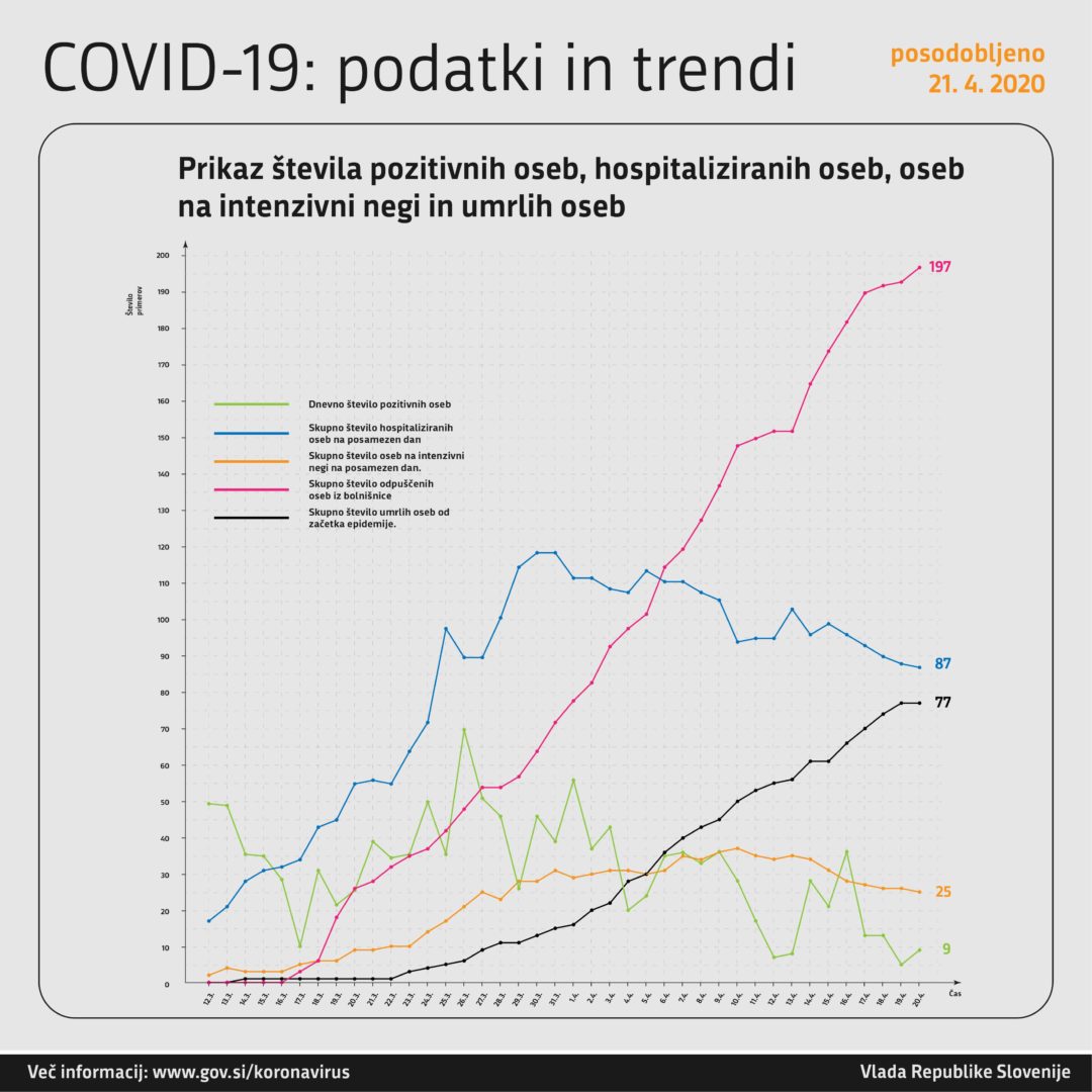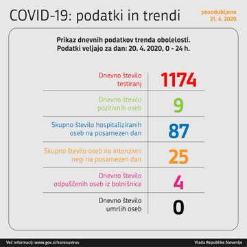 Vsekakor pa je jasno, da so včeraj opravili 1174 testiranj (skupaj že 42.976) in pozitivnih je bilo 9 oseb, torej je s covidom-19 okuženih že 1344 oseb. V bolnišnici je 87 oseb, 25 jih je na intenzivni negi. Iz bolnišnice so odpustili 4 osebe in pohvalimo se lahko, da nimamo nobenega na novo umrlega. Torej je v Sloveniji zaradi koronavirusa ali za njegovimi posledicami umrlo že 77 ljudi.
