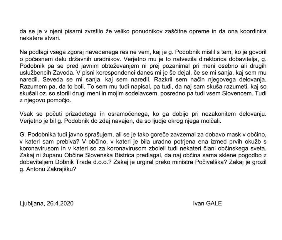 Po tem, ko so v javnost pricurljale informacije, da naj bi bil na spornih pogodbah podpis Ivana Galeta je ta danes na facebook strani oddaje Tarča objavil dodatni obremenili zapis usmerjen proti Marjanu Podobniku, ta pa ga je označil za lažnivca in ga pozval na soočenje. Podobnik za soočenje napoveduje tudi razkritja zakaj je miljon mask prišlo v Slovenijo z mesečnim zamikom in nekatere nepravilnosti pri delovanju blagovnih rezerv. V Časopisu Slovenec smo pripravljeni organizirati javno soočenje preko videokonference, ki v torek, 28. aprila ob 12:00, v kolikor bo g. Gale na soočenje pristal.