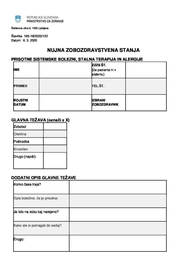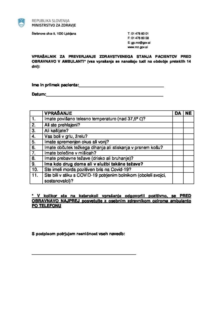 Pacienti bodo morali pred obravnavo tako pri zobozdravniku kot pri drugem zdravniku rešiti enega izmed spodnjih vprašalnikov in na ta način bodo jamčili, da so zdravi.