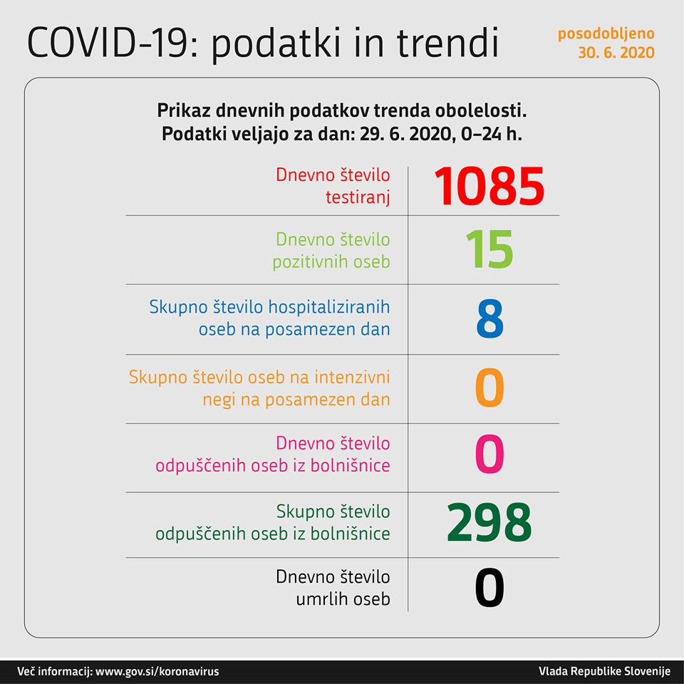 V Sloveniji so v ponedeljek ob 1085 testih potrdili 15 okužb z novim koronavirusom, je vlada sporočila na Twitterju. Pet okužb so potrdili v Ljubljani, po dve okužbi v Mariboru, Slovenski Bistrici in med tujimi državljani, eno pa v občinah Brezovica, Kočevje, Miklavž na Dravskem polju in Ptuj. Doslej so skupaj potrdili 1600 okužb.