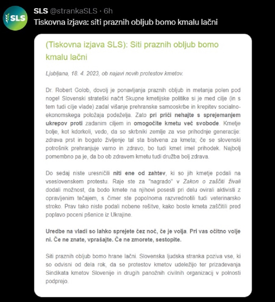 *Prehranska varnost Slovenije je iz dneva v dan bolj ogrožena. Druge države članice Evropske unije so že odreagirale na ceneni uvoz živil vprašljive kakovosti iz Ukrajine. Kaj pa mi?! Ta živila so že na naših trgovskih policah in še več jih prihaja! Pozivamo potrošnika, da tega ne dopustimo.«
